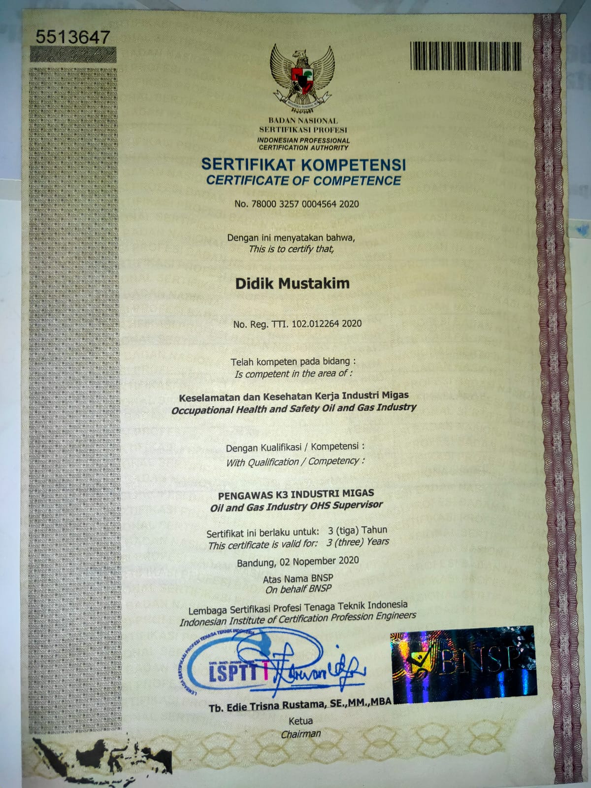 | No Sertifikat | : | 78000 3257 0004564 2020 |